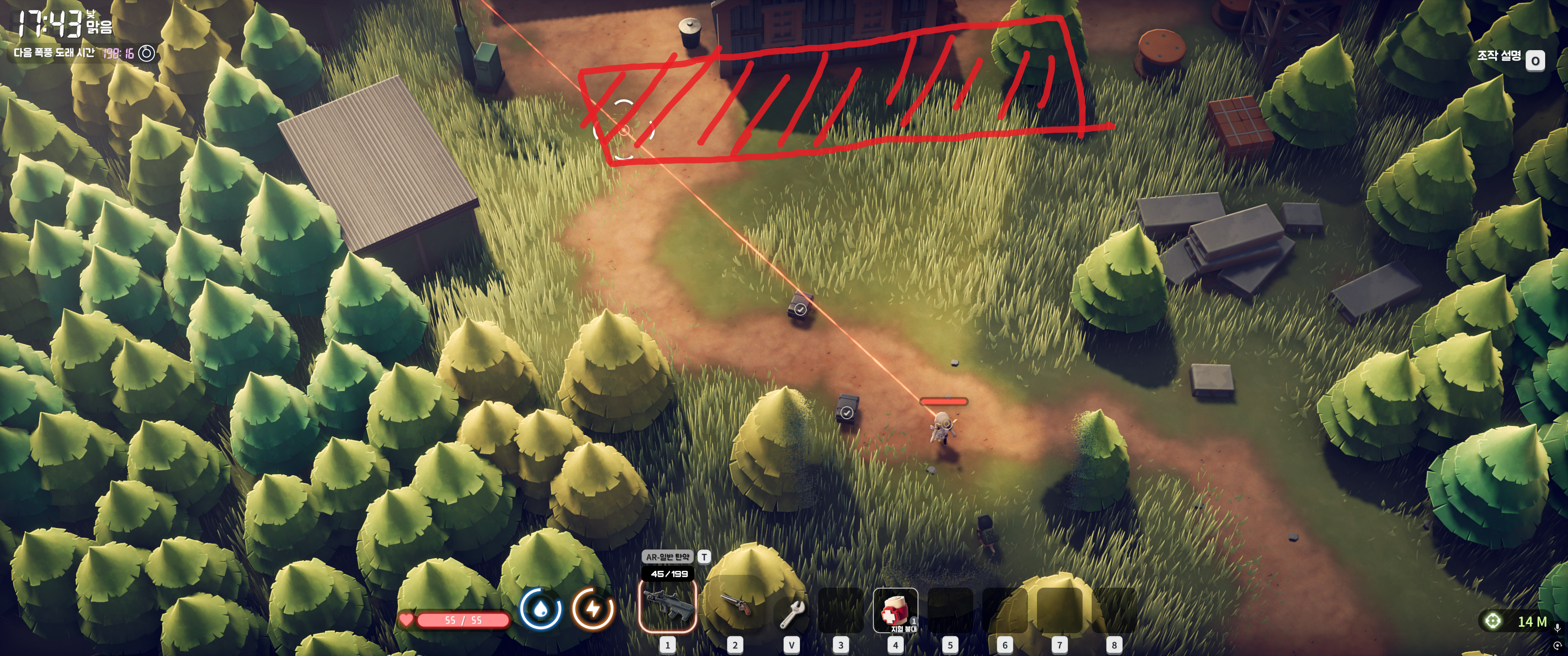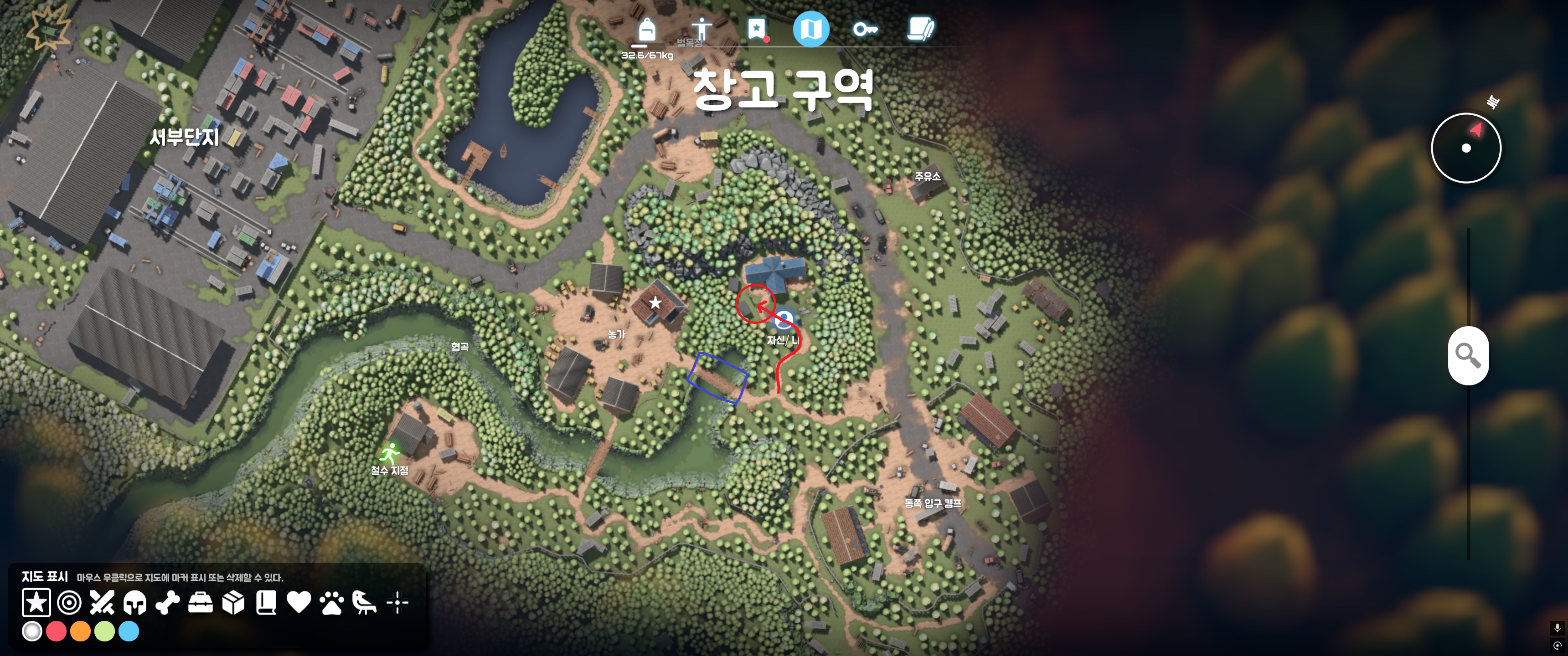 파란색 위치의 다리는 최초에 붕괴되어있으므로, 나무 판자 4개로 시설 수리가 가능합니다(퀘스트랑 무관)