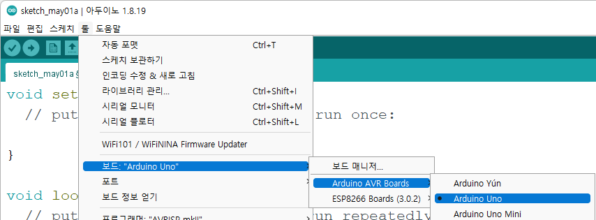 메뉴의 보드 : "Arduino Uno"를 선택해주세요.