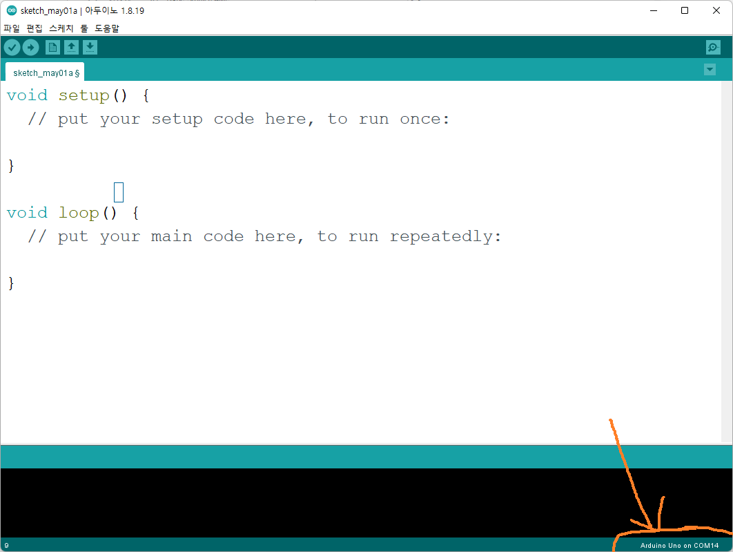 [초기설정]이 완료되면, 아두이노 프로그램의 우측 하단에 해당 보드와, COM숫자 가 나타납니다. 이제부터 우리는 COM숫자를 포트 라고 지칭하겠습니다.