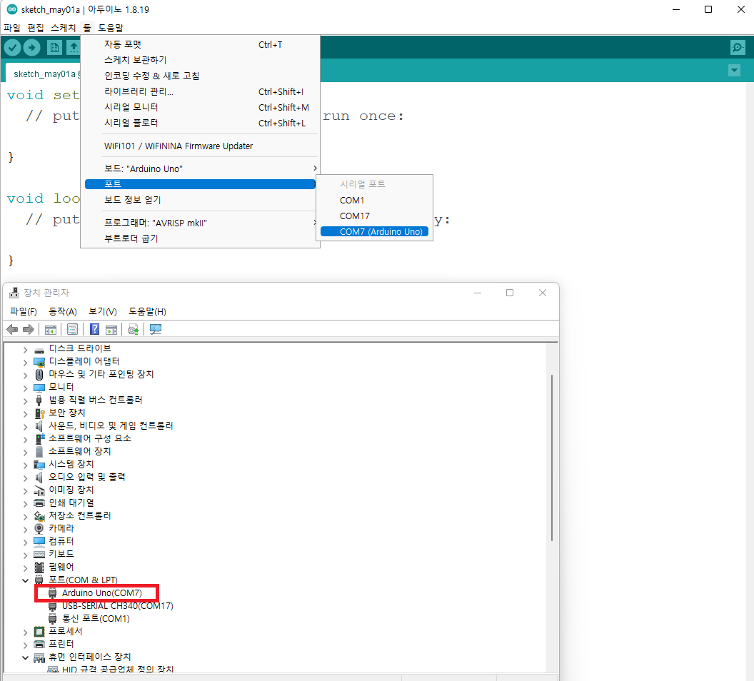 [포트] 를 찾은 후, Arduino Uno 혹은