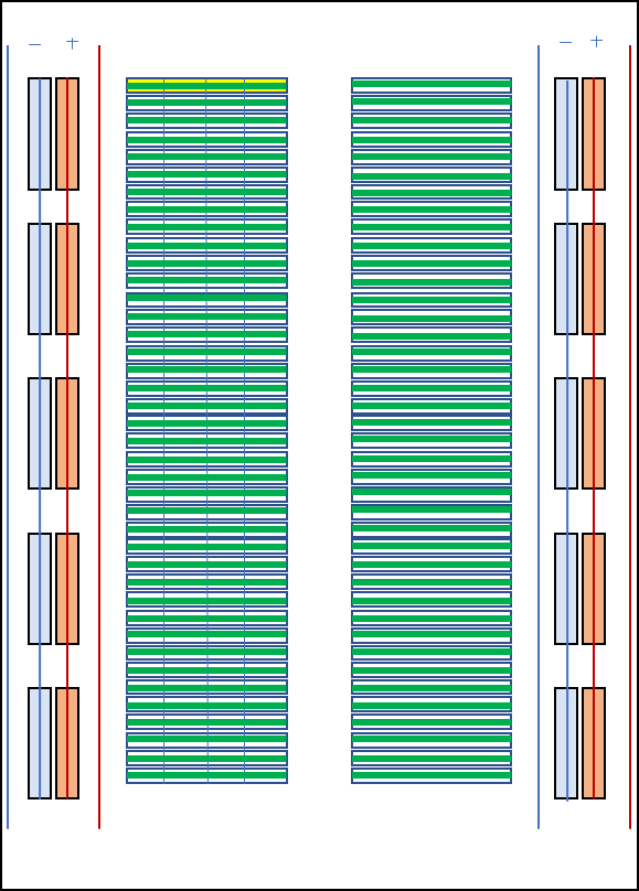 파란 색칠된 네모에 -를 연결하면, 세로줄 전체가 -극이 됩니다.