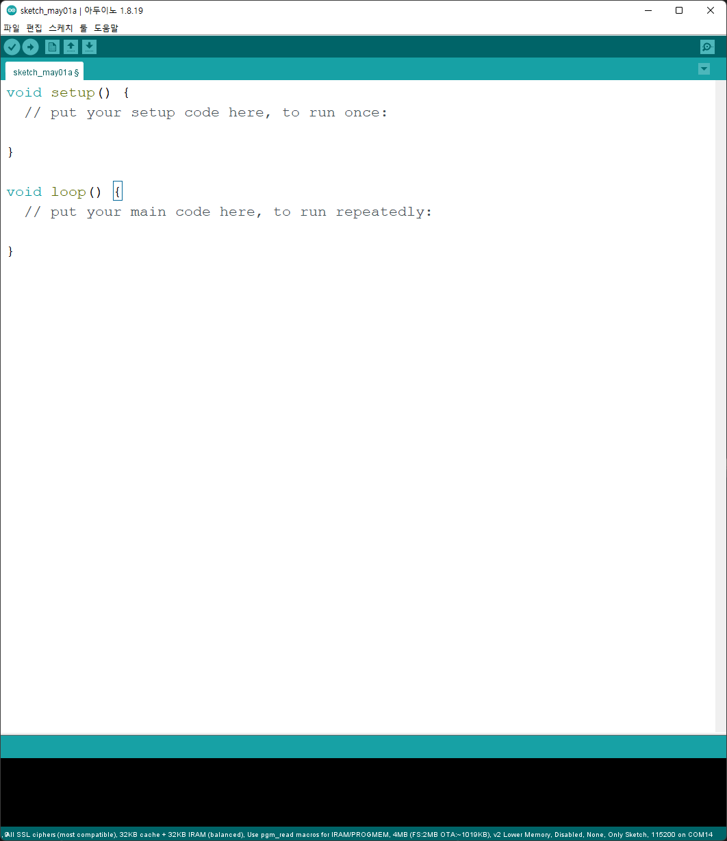 [초기설정]이 완료되면, 아두이노 프로그램의 우측 하단에 해당 보드와, COM숫자 가 나타납니다. 이제부터 우리는 COM숫자를 포트 라고 지칭하겠습니다.