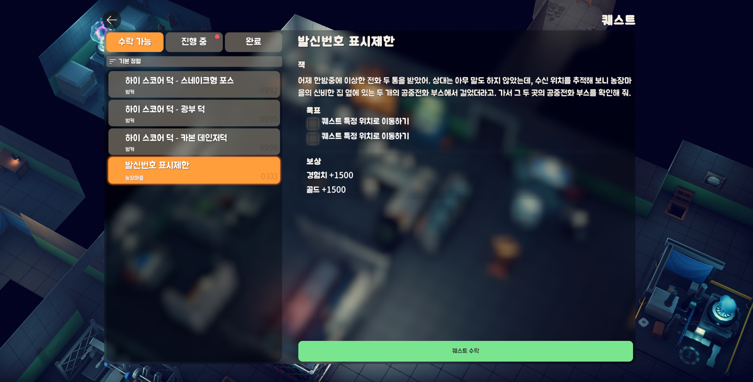 X, O 마크방 근처에 있는 전화부스 가까이 닿으면 완료되는 퀘스트 입니다.